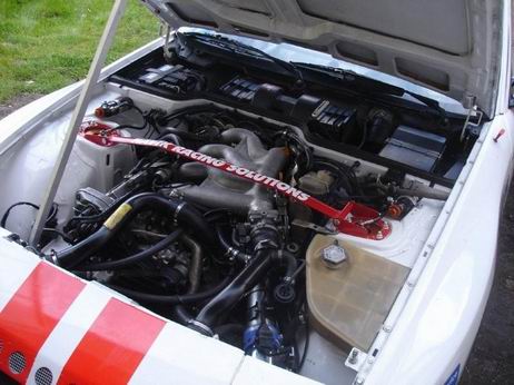 Ook in de motorruimte zijn de voor de autoracerij overbodige onderdelen verwijderd. |